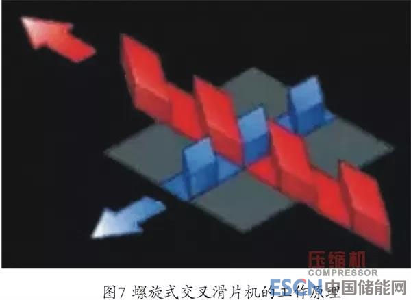 螺旋式交叉滑片結(jié)構(gòu)(Toroidal Intersecting Vane Machine)是一種富有創(chuàng)造性的機械結(jié)構(gòu),屬于容積式機械。其工作原理如圖7所示,兩組呈90°的滑片鏈相互嚙合形成壓縮空腔,并通過交叉旋轉(zhuǎn)來壓縮空氣。