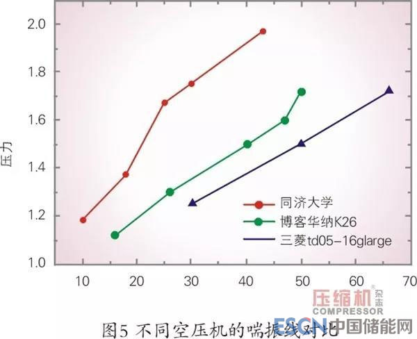 其空壓機所采用的水潤滑軸承,相比較空氣潤滑方式,不需要空壓機提供額外的高 壓空氣用于空氣軸承,提高了壓縮機的做功能力,但同時水潤滑軸承需要增加額外的潤滑水路和驅(qū)動裝置,使得系統(tǒng)更加復(fù)雜化。圖5為不同空壓機的喘振線對比。