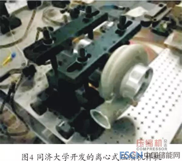 設(shè)計參數(shù)如下:最大空氣流量:80g/s;壓比:1.5~2.5;潤滑:水潤滑方式;系統(tǒng)功耗:<10kW。圖4為同濟大學(xué)開發(fā)的離心式壓縮機樣機。