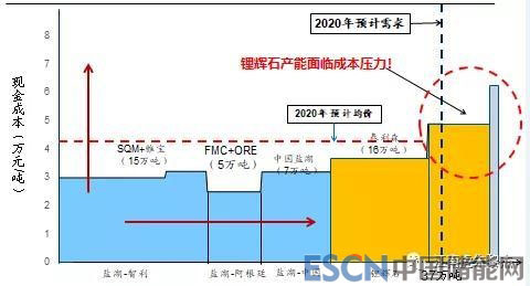 從圖中可以看到,到2020年,成本最低的鹽湖體系大約可以貢獻(xiàn)27萬噸的量,而礦石體系中成本最低的泰利森可以貢獻(xiàn)約16萬噸碳酸鋰的量,這兩者就已經(jīng)可以可以貢獻(xiàn)43萬噸的量了??紤]到檢修、礦(或鹵水)與鋰化工產(chǎn)能的磨合等問題,我們打個9折,也有近39萬噸的量。