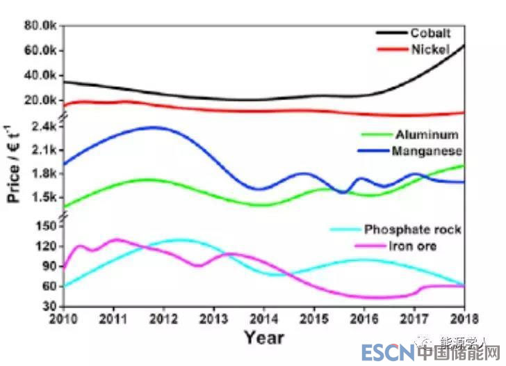 生產成本無疑是產業(yè)化必須要考慮的問題之一,本文作者總結了近年來組成Li嵌入式正極材料的金屬元素的市場價格,如圖5。其中元素Co和元素Ni的價格普遍高于元素Al和元素Mg,而元素P和Fe具有相對更低的價格。值得注意的是元素Co從2016年起,價格飛升,這無疑會提升基于元素Co等LCO等正極材料的成本,對其更大的規(guī)?;l(fā)展有一定影響。