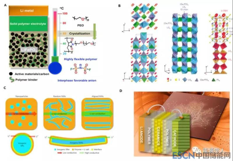 固態(tài)電解質包括聚合物固態(tài)電解質、無機固態(tài)電解質以及聚合物-無機復合固態(tài)電解質,固態(tài)電解質從發(fā)現(xiàn)到現(xiàn)在已經有40多年,然而僅有基于聚合物電解質的Li/PEO/LFP電池在Bollore Bluecar中得到了應用,但是其必須搭載加熱裝置使電池在70℃進行工作,這主要是因為使用半結晶的PEO電解質造成的。那么,能否開發(fā)室溫固態(tài)電解質呢?本文介紹了Armand等人設計出了一種室溫聚合物(Jeffamines)電解質,其匹配的Li/LFP電池能夠在室溫下具有很高的電導率并且表現(xiàn)出優(yōu)異的界面性能,如圖3A所示。另外,Kamaya等人報道了Li10GeP2S12(LGPS)無機固態(tài)電解質(圖3B),室溫下離子電導率能夠達到1.23*10-2 S/cm,并且該固態(tài)電解質能夠匹配LFP、LCO, NCA, LNMO等Li嵌入式正極。對于聚合物-無機復合固態(tài)電解質,早在1980s就有報道,在聚合物中加入納米Al2O3便能提高電解質的機械性能和離子電導率,最近幾年,Cui等人將納米線狀的LLTO加入到PAN聚合物電解質中從而顯著提升了其離子電導率,如圖3C所示。Goodenough等人提出了聚合物-無機陶瓷-聚合物的“三明治”結構的復合固態(tài)電解質(圖3D),中間的陶瓷層阻止了鋰鹽中的陰離子的穿梭,從而提高了鋰離子遷移數(shù),但同時也帶來了體積膨脹,能量密度降低等問題。
