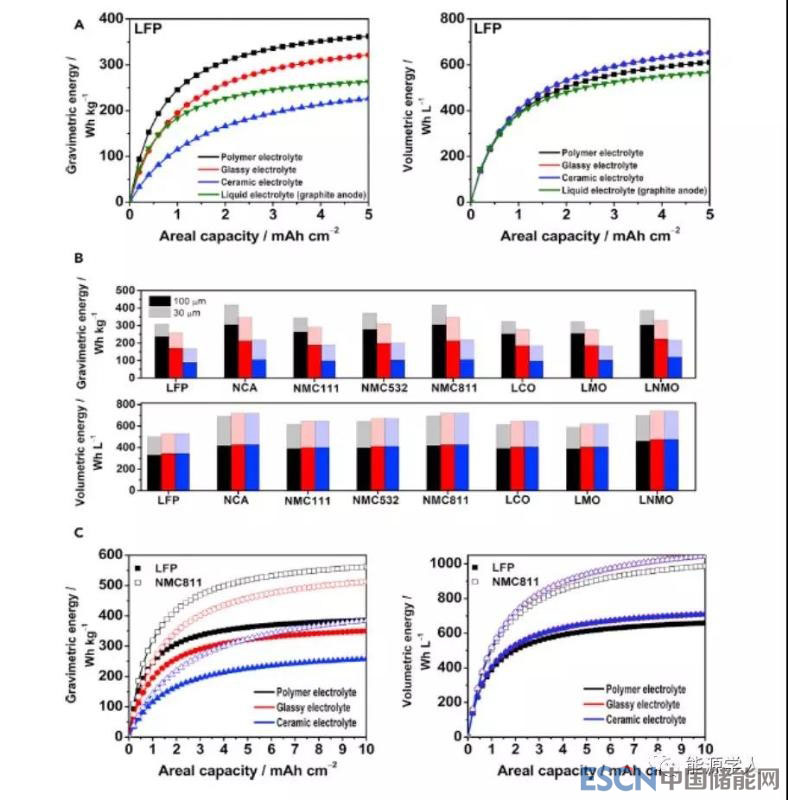 Fig 2. Gravimetric and Volumetric Energy Densities of LICBs (A) Different kinds of electrolytes (30 mm in thickness for SEs). (B) Different thicknesses (areal loading, 2 mAh/cm2); theblack, red, and blue colors refer to representative polymer (i.e.,poly(ethylene oxide)-based), glassy (i.e., Li2S-P2S5),and ceramic electrolytes (i.e., Li6.55Ga0.15La3Zr2O12),respectively. (C) Two representative cathode materials, LFP and NMC811 (30 μm inthickness SEs).