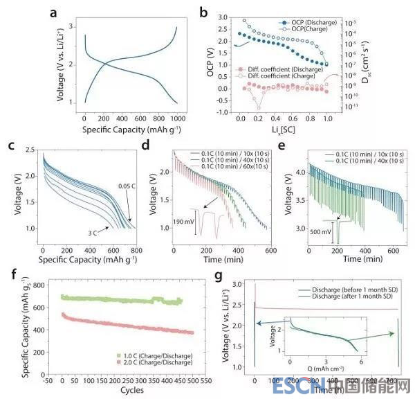 圖4. Li|Li-MWCNT作為負(fù)極,SC作為正極的鋰硫全電池的電化學(xué)表征