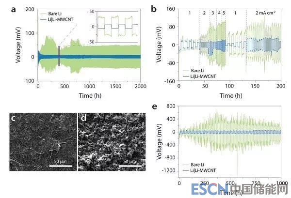 2. Li-MWCNT界面層充當(dāng)鋰沉積過程的媒介,均勻化鋰離子流,從而阻止鋰枝晶的生長(zhǎng);