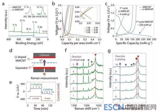 鋰離子媒介機(jī)制:為了研究Li-MWCNT界面對(duì)鋰負(fù)極的穩(wěn)定性,使用Li-MWCNT覆蓋的鋰負(fù)極構(gòu)建對(duì)稱電池進(jìn)行原位Raman測(cè)試。通過G帶(1585-1604 cm?1)的偏移與分裂可辨認(rèn)Li-MWCNT在沉積/脫出過程中的組成。如圖2f所示,在脫鋰過程中,僅有1604 cm?1處的單峰。這是因?yàn)榻饘黉囇趸碾妱?shì)低于Li-MWCNT脫鋰的電勢(shì);而在沉鋰過程中(圖2g),則出現(xiàn)了1586 cm?1和1604 cm?1兩個(gè)峰,說明在沉鋰過程中,MWCNT始終處于鋰化不完全的狀態(tài)。即在鋰的沉積過程中,Li-MWCNT既給下層金屬鋰提供被還原的鋰離子,又接受著來自電解質(zhì)的鋰離子的嵌入,處于一個(gè)動(dòng)態(tài)變化,相對(duì)平衡的狀態(tài)。在這樣一個(gè)過程中,Li-MWCNT層起到了一個(gè)緩沖的作用,將來自電解液的鋰離子流進(jìn)行均勻分散后再傳給金屬鋰發(fā)生鋰沉積。