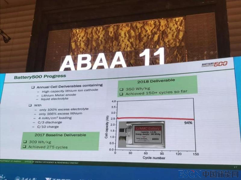 這一電池的技術(shù)路線是高比能鋰離子正極(鎳鈷錳)和鋰金屬負(fù)極。2017年這一項目已經(jīng)實現(xiàn)了309wh/kg,但循環(huán)次數(shù)只有275次;2018年,已經(jīng)實現(xiàn)350wh/kg,循環(huán)次數(shù)150次。