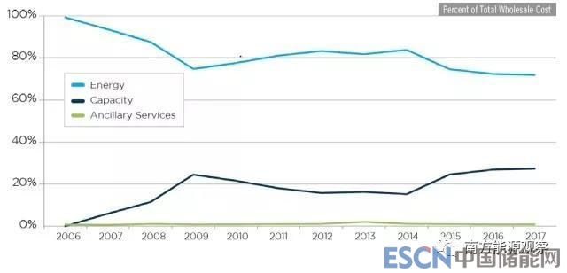 此外,從2006年到2017年間,PJM電力批發(fā)市場的成本結構也發(fā)生了變化。從批發(fā)市場的角度看,發(fā)電廠能在能量市場、容量市場以及輔助服務市場中獲得利潤。圖一中藍色為能量市場占比,深藍色為容量市場占比。近年來,比例由以往的能量市場占絕對主導地位,變成了容量市場向上攀升。