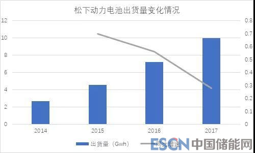 松下電器產(chǎn)業(yè)株式會社創(chuàng)建于1918年,于1994年開始研發(fā)可充電鋰離子電池。1998 年松下開始量產(chǎn)筆記本電腦專用的圓柱形鋰離子電池,并建成了業(yè)內(nèi)領(lǐng)先的鋰離子電池生產(chǎn)線。2008年11月,松下宣布與三洋電機合并,一躍成為全球最大的鋰電池供應(yīng)商。隨著新能源汽車的興起,松下動力電池業(yè)務(wù)營業(yè)收入快速增長,2017年動力電池出貨量約為10GWh。