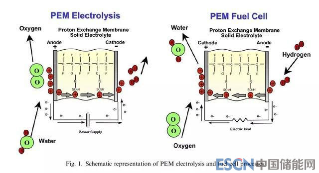 圖1.PEM純水電解和PEM燃料電池工作原理圖對(duì)比
