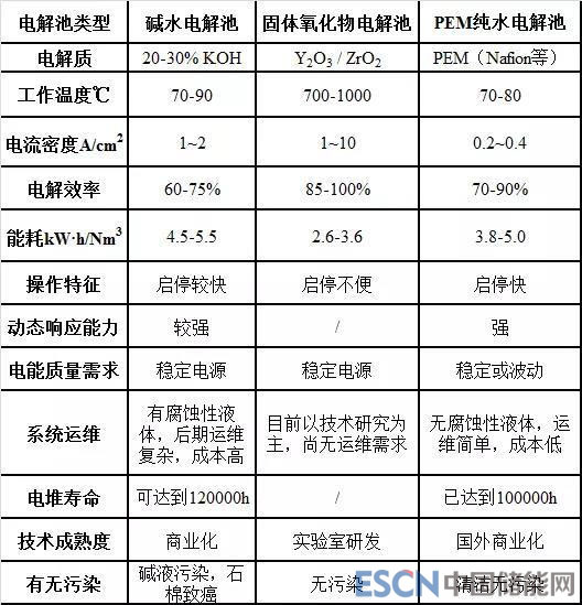 德國(guó)最早引入P2G(powertogas)的概念,即利用可再生能源導(dǎo)入量的擴(kuò)大,利用風(fēng)力發(fā)電、太陽(yáng)能發(fā)電等的剩余電力電解水生成氫,然后提供給現(xiàn)有的燃?xì)夤艿谰W(wǎng)絡(luò)電解水技術(shù)路線。目前電解水技術(shù)可分為三種,堿水電解、固體氧化物電解和PEM純水電解水技術(shù),技術(shù)參數(shù)對(duì)比詳見(jiàn)表1。