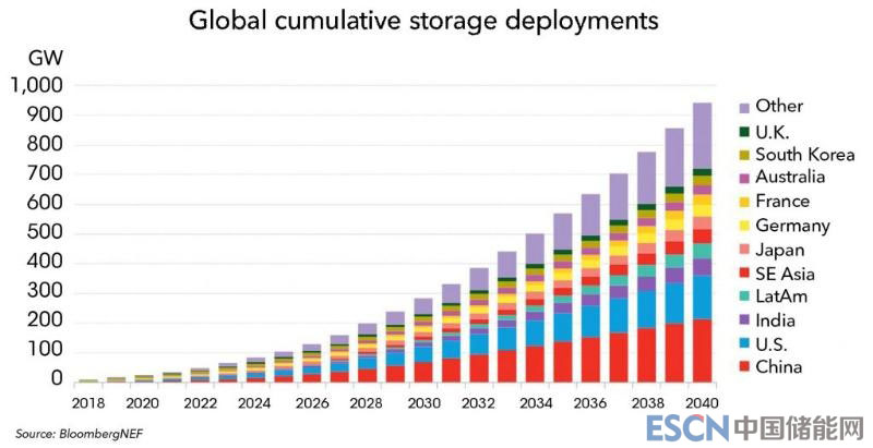 中國、美國、印度、日本、德國、法國、澳大利亞、韓國和英國將成為主要的儲能市場。到2040年,這九個市場將占全球裝機容量的三分之二。在短期內(nèi),韓國將主導市場,美國將在2020年初超越韓國,但在21世紀20年代將被中國超越,中國的主導地位將持續(xù)到2040年。