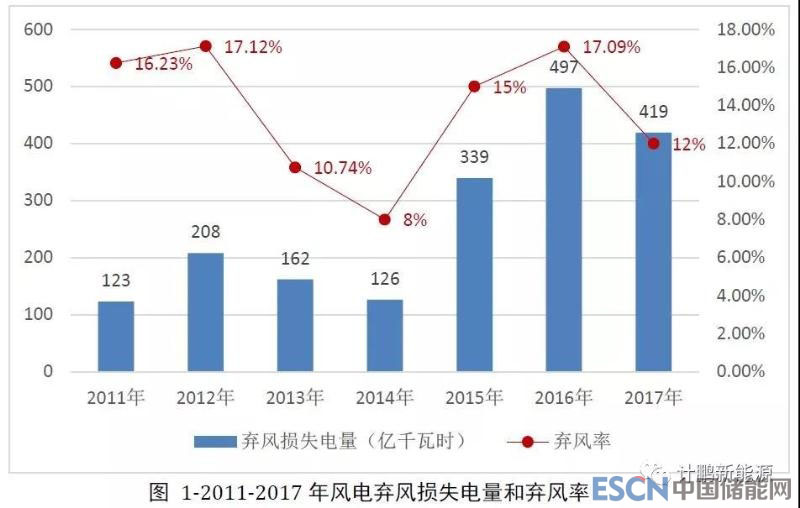 據(jù)行業(yè)統(tǒng)計(jì)數(shù)據(jù),2011年-2017年我國(guó)風(fēng)電棄風(fēng)率呈現(xiàn)波浪式變化。其中,2014年棄風(fēng)率最低,全國(guó)平均棄風(fēng)率8%;2012年和2016年棄風(fēng)率最高,全國(guó)平均棄風(fēng)率超過(guò)17%。2017年棄風(fēng)限電形勢(shì)大幅好轉(zhuǎn),全國(guó)平均棄風(fēng)率12%,同比下降5.09個(gè)百分點(diǎn)。