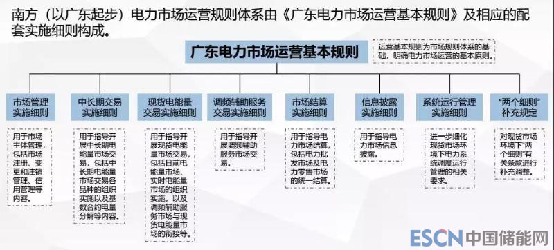 南方(以廣東起步)電力市場運營規(guī)則體系由《廣東電力市場運營基本規(guī)則》及8個配套實施細則構(gòu)成,簡稱“1+8”規(guī)則體系。其中,市場運營基本規(guī)則是整個市場規(guī)則體系的基礎(chǔ),明確廣東電力市場運營相關(guān)方面的基本原則,另外8個細則以基本規(guī)則為基礎(chǔ),分別對中長期交易、現(xiàn)貨電能量交易、調(diào)頻市場交易、市場結(jié)算、信息披露、市場準入退出管理和信用管理等8個方面做出指引和約束。
