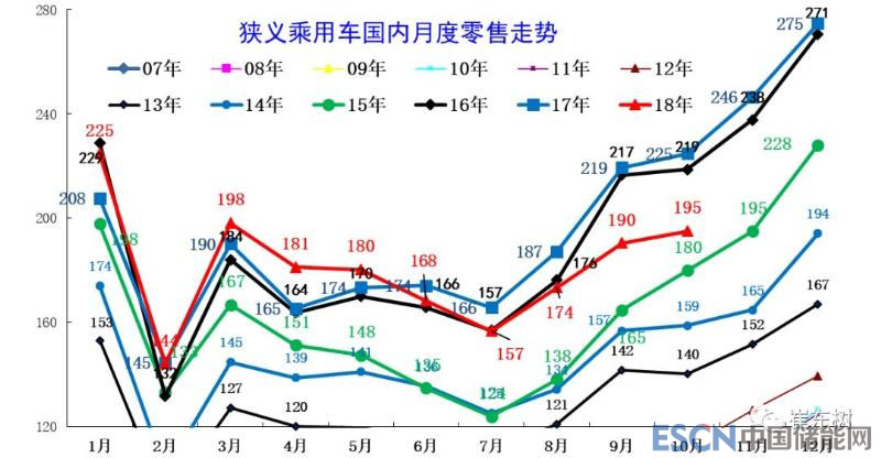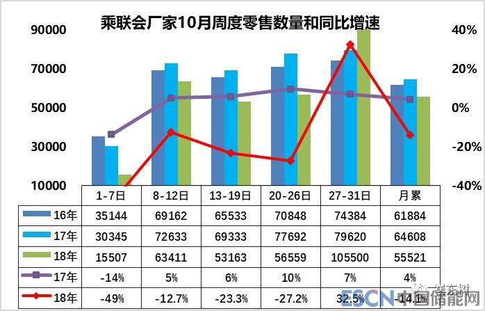 中國(guó)儲(chǔ)能網(wǎng)訊:18年10月狹義乘用車零售195萬(wàn)臺(tái),同比2017年10月下降13.2%,環(huán)比9月增長(zhǎng)2%。今年10月環(huán)比增長(zhǎng)的走勢(shì)延續(xù)了過去三年的銀九金十的規(guī)律,但并非簡(jiǎn)單消費(fèi)拉動(dòng)。歷來(lái)9月購(gòu)車換車迎接國(guó)慶出游較明顯,過去兩年的購(gòu)置稅優(yōu)惠政策的退出效應(yīng)推動(dòng)年末銷量逐步加速走高。因?yàn)楦呋鶖?shù)壓力較大,今年10月的周度批零銷量走勢(shì)頑強(qiáng)拉升。