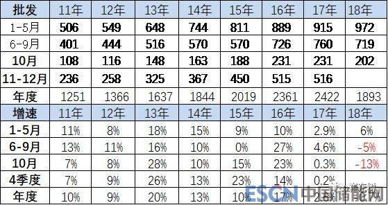 18年車市的批走勢(shì)出現(xiàn)較大下降趨勢(shì),18年10月份達(dá)到202萬(wàn)臺(tái),同比增長(zhǎng)-11%,10月份批發(fā)銷量達(dá)到202萬(wàn)臺(tái),同比增速達(dá)到-12%。10月的批發(fā)增速劇烈下滑。18年1到10月份,總體同比增長(zhǎng)仍達(dá)到1%的水平,基本符合預(yù)期。