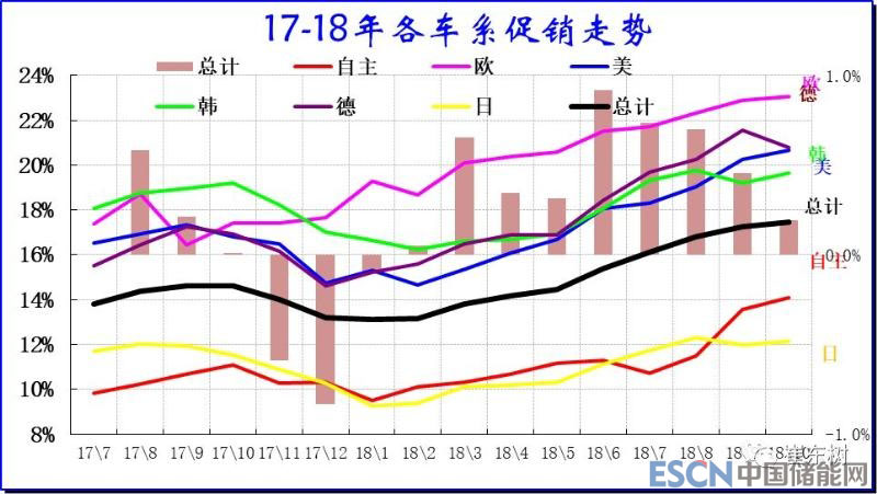 18年10月到10月,車系促銷力度相對(duì)較大,尤其是10月促銷,增長(zhǎng)相對(duì)較忙,而在2017年是10月促銷力度相對(duì)較大。今年的車市下滑等因素,導(dǎo)致10月車市相對(duì)處于動(dòng)蕩之中,歐系和德系,以及韓系促銷力度增長(zhǎng)都相對(duì)較猛。
