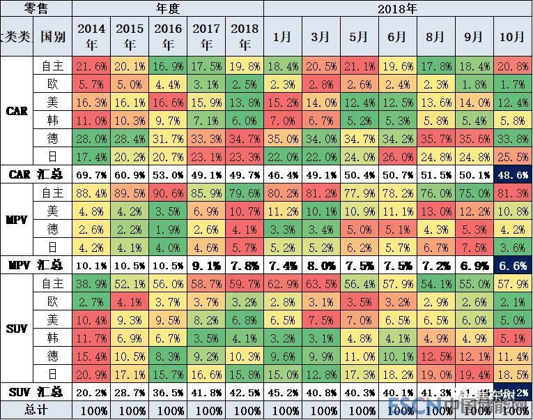 18年10月的自主份額稍降。18年自主份額走強(qiáng)主要也是合資的市場(chǎng)表現(xiàn)較弱,高端需求火爆,高低兩端擠壓合資的需求。自主的主力市場(chǎng)出現(xiàn)分化現(xiàn)象,自主的SUV新購(gòu)需求相對(duì)走弱,導(dǎo)致自主的表現(xiàn)不強(qiáng)。10月份額達(dá)到41%的份額,較去年同期的43%的稍有下滑,這與歷年走勢(shì)有一定反差,體現(xiàn)自主的巨大壓力趨勢(shì)。