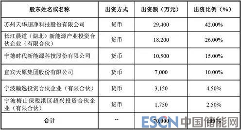 天華超凈(300390)11月13日公告,公司與寧德時代(300750)、長江晨道(湖北)新能源產(chǎn)業(yè)投資合伙企業(yè)(有限合伙)、宜賓天原集團股份有限公司等公司簽署《投資協(xié)議書》,擬共同投資設(shè)立宜賓市天宜鋰業(yè)科創(chuàng)有限公司(下稱“天宜鋰業(yè)”),注冊資本7億元。各方出資占比情況如圖:
