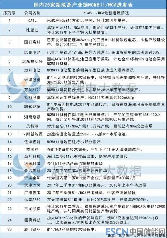 起點(diǎn)鋰電大數(shù)據(jù)記者做了25家國(guó)內(nèi)新能源產(chǎn)業(yè)鏈NCM811/NCA的企業(yè)進(jìn)度表: