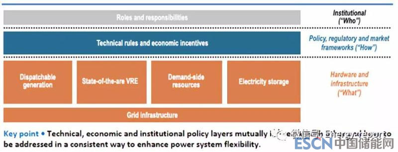 電力系統(tǒng)的靈活性取決于可用的硬件和基礎(chǔ)設(shè)施(“什么”)、政策、監(jiān)管和市場(chǎng)框架(“如何”)以及提供靈活性的實(shí)體(“誰(shuí)”)的體制角色和責(zé)任。這三個(gè)方面必須協(xié)同工作才能提高系統(tǒng)的靈活性(圖ES.1)。