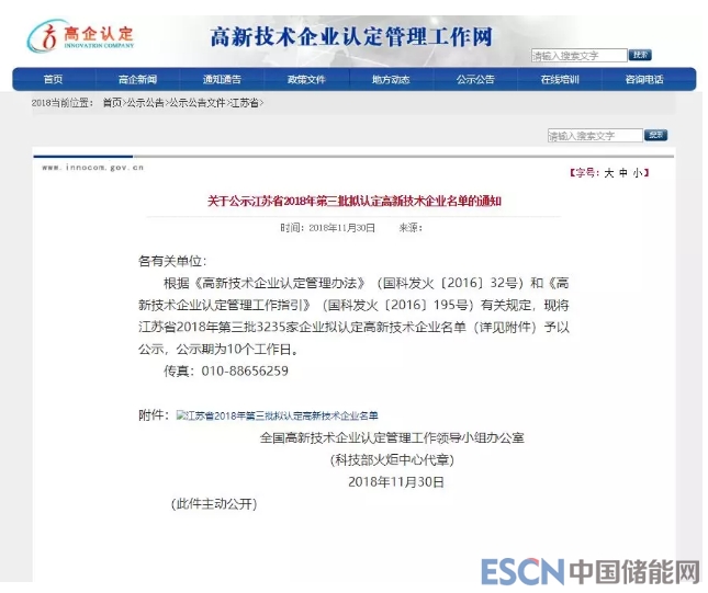 中國儲(chǔ)能網(wǎng)訊:11月30日,全國高新技術(shù)企業(yè)認(rèn)定管理工作領(lǐng)導(dǎo)小組辦公室公布了“江蘇省2018年第三批擬認(rèn)定高新技術(shù)企業(yè)名單”,天臣新能源旗下子公司——天臣新能源研究南京有限公司(以下簡稱:天臣新能源南京研究院)獲得國家級(jí)高新技術(shù)企業(yè)認(rèn)定。