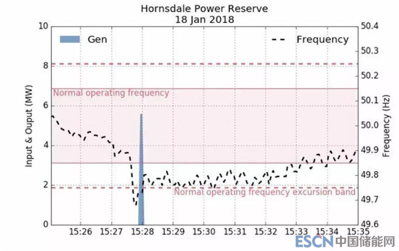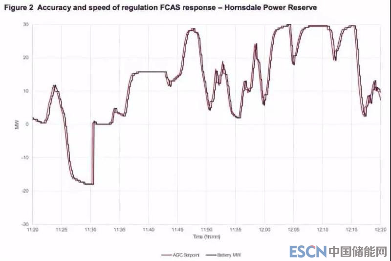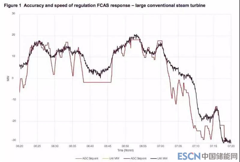 2017年12月14日,澳大利亞最大發(fā)電站之一LoyYang燃煤發(fā)電廠意外跳閘,而遠(yuǎn)在1000公里外的特斯拉電池在140毫秒內(nèi)輸送了100MW電力,12月22日LoyYang的另外一個(gè)燃煤機(jī)組發(fā)生故障,特斯拉再次出手相救,在數(shù)毫秒內(nèi)輸送16兆瓦電力。但特斯拉方面針對(duì)解救電網(wǎng)的響應(yīng)服務(wù)發(fā)出抱怨,因?yàn)殡姵仨憫?yīng)速率太快、而計(jì)費(fèi)系統(tǒng)沒(méi)有及時(shí)反應(yīng)并記錄其對(duì)電網(wǎng)服務(wù)的時(shí)間,所以并沒(méi)有收到應(yīng)有的報(bào)酬。澳大利亞能源市場(chǎng)運(yùn)營(yíng)商在一份新報(bào)告中也證實(shí),與傳統(tǒng)的汽輪機(jī)(圖3)相比,儲(chǔ)能系統(tǒng)響應(yīng)更快速、更準(zhǔn)確和更有價(jià)值(圖4)。