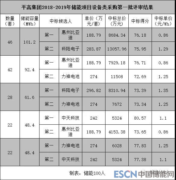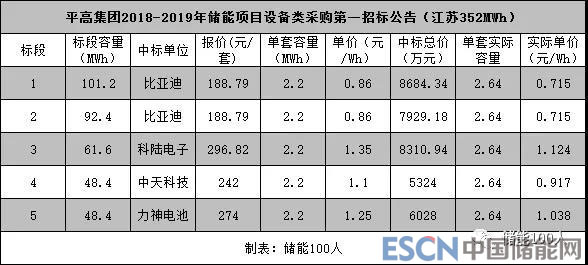 中國(guó)儲(chǔ)能網(wǎng)訊:12月6日,平高集團(tuán)發(fā)布2018-2019第一批儲(chǔ)能項(xiàng)目設(shè)備類(lèi)采購(gòu)招標(biāo)結(jié)果,由于這是江蘇電網(wǎng)側(cè)儲(chǔ)能的大工程,平高此番高達(dá)352MWh的儲(chǔ)能項(xiàng)目招標(biāo),一直是業(yè)界角力的最大節(jié)點(diǎn)。通過(guò)招標(biāo),比亞迪、中天、科陸、力神中標(biāo),其中比亞迪成為最大贏家。各家中標(biāo)大致如下: