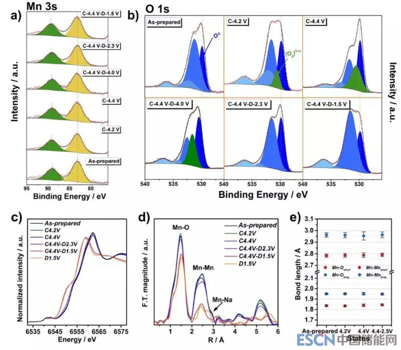 這說明在鈉離子脫出過程中,錳離子的化學(xué)價態(tài)并沒有發(fā)生明顯改變,只是其配位環(huán)境發(fā)生了輕微的改變。對擴展X射線吸收精細結(jié)構(gòu)(EXAFS)譜進行擬合,結(jié)果表明樣品在2.3-4.4V之間Mn-O鍵和Mn-Mn鍵的鍵長并沒有明顯的改變。除了極微小的鍵長變化,圖 4d顯示Mn-O,Mn-Mn以及Mn-Na鍵對應(yīng)的傅里葉變換幅值也有微小變化,這表明Mn的配位環(huán)境發(fā)生了輕微的改變。