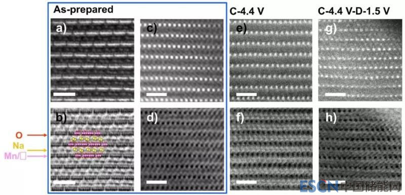 圖3. (a-c, e和g)分別為新制備Na4/7[Mn6/7(□Mn)1/7]O2樣品、充電至4.4V和充電至4.4V再放電至1.5V樣品的HAADF圖像,(b-d, f和h)分別為與(a-c, e和g)狀態(tài)相對應(yīng)的ABF圖像。