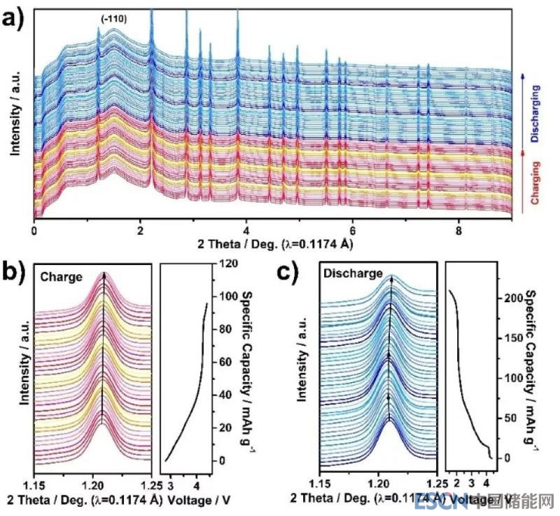 圖 2. (a)在鈉離子脫出和嵌入過程中Na4/7[Mn6/7(□Mn)1/7]O2的原位同步輻射XRD (λ=0.1174 ?)譜圖。(b)和(c)分別為充電和放電過程中(-110)峰演化的放大圖。