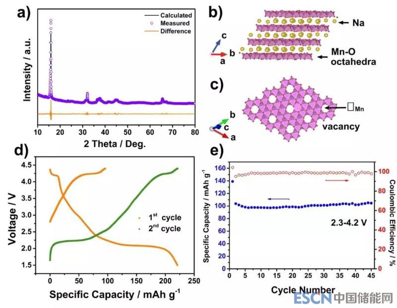 圖1. 新制備Na4/7[Mn6/7(□Mn)1/7]O2材料的XRD譜圖(a)及其分別沿著(b)和垂直(c)于(-110)方向的晶體結(jié)構(gòu)示意圖。(d)和(f)分別為作為鈉離子電池電極材料在1.5-4.4V間充放電的電壓曲線和在2.3-4.2V間充放電的循環(huán)性能。電流密度均為20 mAg-1。