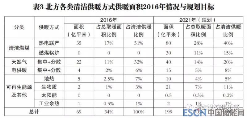 根據(jù)《北方地區(qū)冬季清潔取暖規(guī)劃(2017~2021年)》,到2021年,我國北方地區(qū)清潔取暖面積將達(dá)到200億平方米,占北方地區(qū)總?cè)∨娣e的比例達(dá)70%。各類清潔供暖方式供暖面積與規(guī)劃目標(biāo)詳見表3。