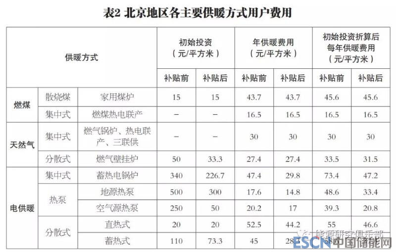 從用戶取暖價(jià)格角度,各種取暖方式經(jīng)濟(jì)性由高到低依次為:集中燃煤供暖、集中天然氣供暖、分散式天然氣供暖、熱泵、分散式電取暖、蓄熱電鍋爐。計(jì)入政府補(bǔ)貼后,電供暖經(jīng)濟(jì)性有所提高,特別是空氣源熱泵方式的供暖費(fèi)用可接近燃煤集中供暖。以北京地區(qū)為例,不考慮政府補(bǔ)貼時(shí),集中供暖方式下每戶供暖季支付費(fèi)用不高于30元/平方米,散燒煤取暖費(fèi)用使用煙煤26.9元/平方米、無煙煤45.6元/平方米,天然氣壁掛爐33.5元/平方米,熱泵供暖39.3~48.6元/平方米。考慮政府補(bǔ)貼后,電供暖費(fèi)用可下降15%~36%,特別是空氣源熱泵,可低至20.8元/平方米,低于散燒煤供暖價(jià)格,與燃煤熱電聯(lián)產(chǎn)供暖相近。北京地區(qū)各主要供暖方式用戶費(fèi)用詳見表2。