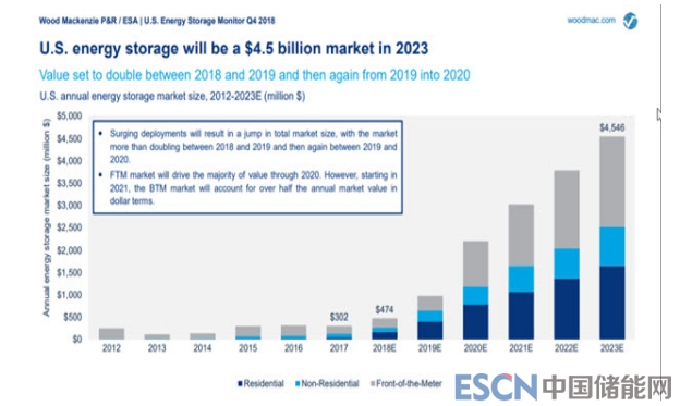 報告預(yù)測,美國儲能市場規(guī)模在2023年將達到45億美元,2018到2019年期間將成倍增長,2019到2020年也將再次翻倍增長。