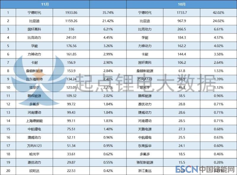 國(guó)軒高科11月裝機(jī)量336.01MWh,占比6.21%,擠進(jìn)前三。
