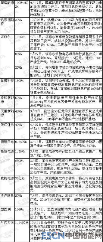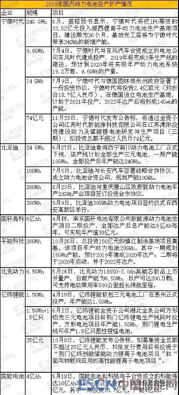 以下是2018年國(guó)內(nèi)動(dòng)力電池投產(chǎn)擴(kuò)產(chǎn)情況一覽表。