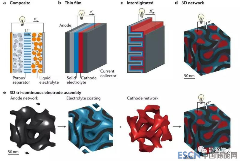 在3D空間中折疊的正極,電解質(zhì)和負(fù)極的三連續(xù)納米級(jí)層可以有助于保持結(jié)構(gòu)穩(wěn)定性(如圖9d),同時(shí)提供諸如短離子擴(kuò)散距離和用于快速電子傳輸?shù)膬?yōu)點(diǎn)。然而,將活性電極材料,集電器和電解質(zhì)組合成三連續(xù)電池是一項(xiàng)艱巨的任務(wù)。電池需要嚴(yán)格分離陽(yáng)極和陰極網(wǎng)絡(luò)以避免短路。電極材料還必須同時(shí)具有氧化還原活性和電子導(dǎo)電性。電解質(zhì)必須提供足夠的離子導(dǎo)電性,同時(shí)足夠電絕緣以防止陽(yáng)極和陰極之間的短路,以及使自放電最小化。自底向上制造方法利用嵌段共聚物中的相分離來(lái)產(chǎn)生空間精確的三連續(xù)電池,通過(guò)將納米級(jí)電化學(xué)組件折疊并集成到互穿網(wǎng)絡(luò)中,所得到的3D架構(gòu)具有顯著減小的占地面積,與使用平面堆疊層的傳統(tǒng)EES裝置相比,具有更高效的體積填充。盡管有概念驗(yàn)證示例,但這種3D三連續(xù)架構(gòu)仍處于研究的早期階段。