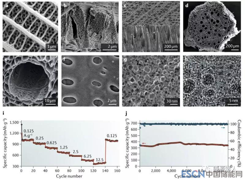圖8 使用生物材料作為模板來(lái)制造用于能量存儲(chǔ)系統(tǒng)的3D分層多孔架構(gòu)。a) 蝴蝶的翅膀。 b) 石蟹殼。 c) 木材有許多垂直于其表面的通道。d-g) 煅燒的3D分級(jí)多孔碳/ SnOx復(fù)合材料的橫截面SEM圖。h) 3D碳/ SnOx復(fù)合材料的高分辨率透射電子顯微鏡(TEM)圖像。i)3D碳/ SnOx復(fù)合電極的倍率性能。j)3D碳/SnOx電極在12.5A/g的高電流密度下的循環(huán)性能。