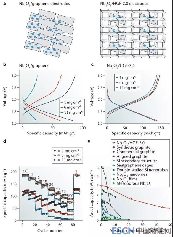 與平面電極相比,3D電極確保在具有實(shí)際的質(zhì)量負(fù)載水平(>10mg/cm2)厚電極中更有效的電荷傳輸和活性材料利用率。實(shí)驗(yàn)表明3D復(fù)合電極提升了電荷傳輸和在高質(zhì)量負(fù)載荷下實(shí)現(xiàn)高活性材料利用率,導(dǎo)致在相同質(zhì)量載荷下比平面電極材料具有更高的面積容量。例如,具有分層多孔結(jié)構(gòu)的3D Nb2O5/HGF-2.0電極在質(zhì)量負(fù)載增加時(shí)維持高性能,而具有隨機(jī)堆疊的導(dǎo)電網(wǎng)絡(luò)的常規(guī)Nb2O5/石墨烯復(fù)合物隨著質(zhì)量負(fù)載增加而顯示出快速降解。隨著質(zhì)量負(fù)荷的增加,Nb2O5/石墨烯復(fù)合電極的電壓-容量曲線顯示出越來(lái)越陡峭的斜率和更大的電壓降,這歸因于較厚電極中較大的內(nèi)阻。復(fù)合材料中的電荷傳輸可以通過(guò)調(diào)整HGF的孔隙率來(lái)優(yōu)化,以在高質(zhì)量負(fù)載下提供高面積容量和高速率能力,這對(duì)于商業(yè)EES裝置是必不可少的。