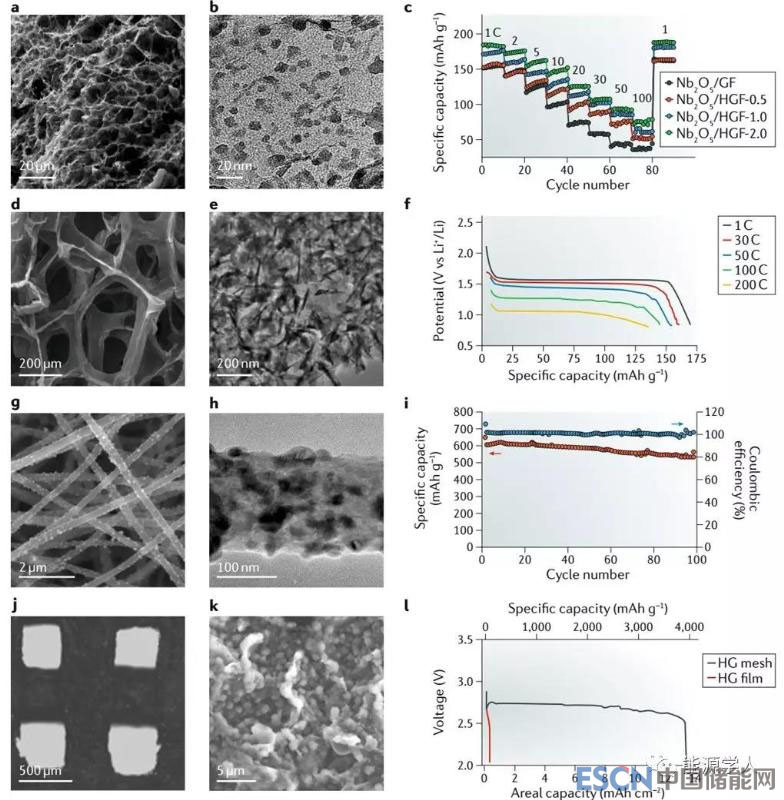 圖6 用于電化學(xué)能量存儲(chǔ)系統(tǒng)的3D分層多孔碳支架。a-c) 自組裝Nb2O5/多孔石墨烯骨架(HGF)復(fù)合電極。d-f)模板輔助石墨烯泡沫的圖像裝載有活性材料Li4Ti5O12(LTO),以形成LTO /石墨烯泡沫混合陽(yáng)極。j-l) 基于擠出的3D打印分層多孔架構(gòu),用作Li-O2電池中的正極。
