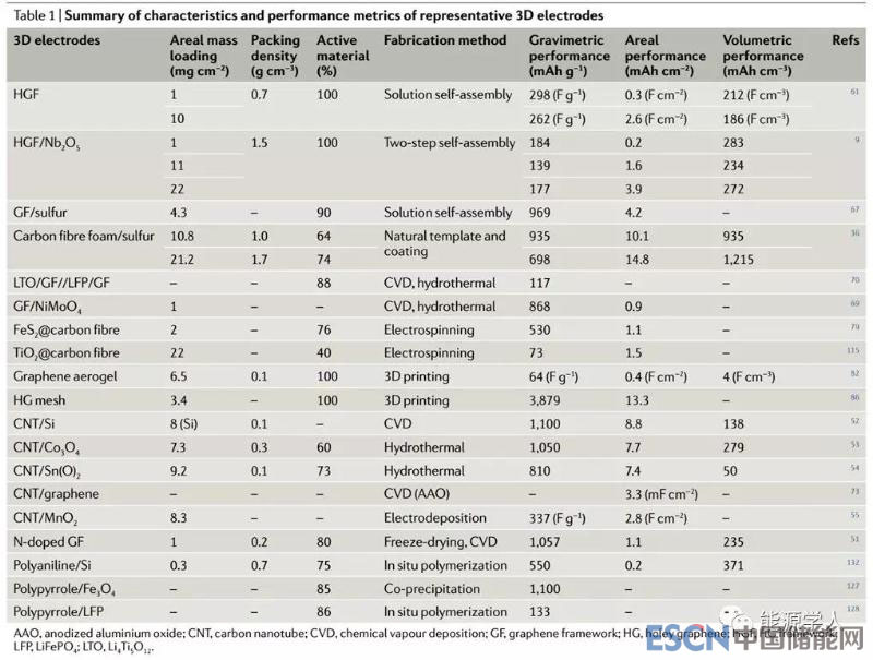 圖5. 代表性3D電極的特征和性能指標(biāo)的總結(jié)