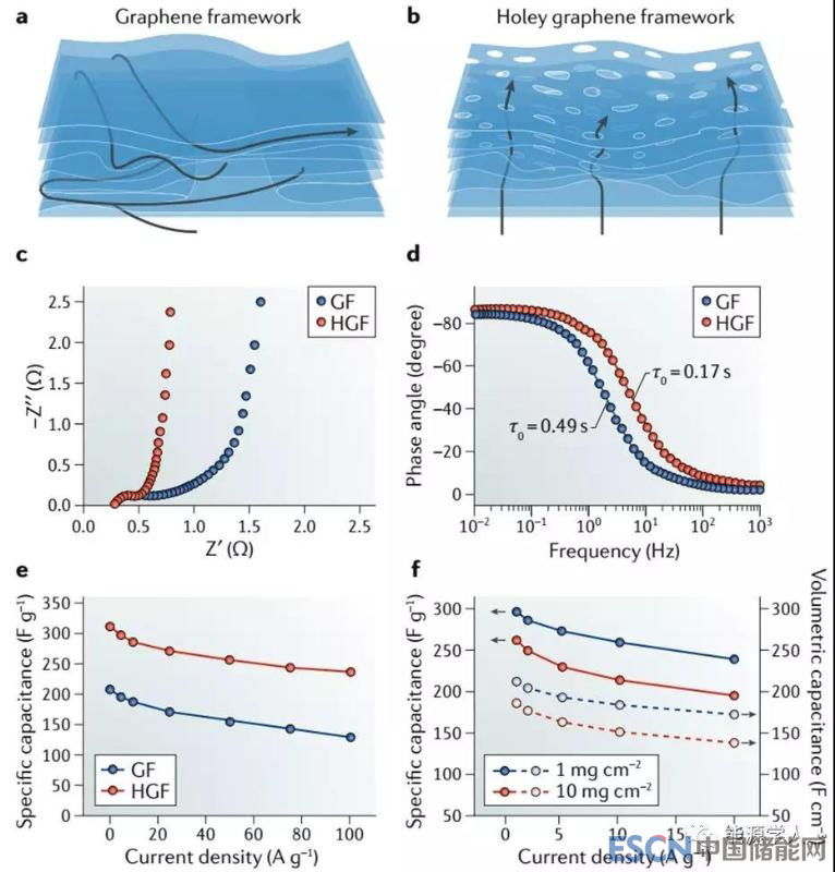 圖4 三維電極的電化學(xué)表征。a) 溶劑化的石墨烯框架(GF)與描述離子運(yùn)輸路徑的箭頭。 b) 溶劑化的多孔石墨烯框架(HGF)與描述離子運(yùn)輸路徑的箭頭。c) 在6M KOH電解質(zhì)中的GF和HGF電極的Nyquist圖。d)作為GF和HGF電極的頻率的函數(shù)的相位角的Bode圖。e)比電容作為6M KOH電解質(zhì)中GF和HGF電極的電流密度的函數(shù)。f)HGF電極的重量和體積電容與純離子液體電解質(zhì)中電流密度的函數(shù)關(guān)系