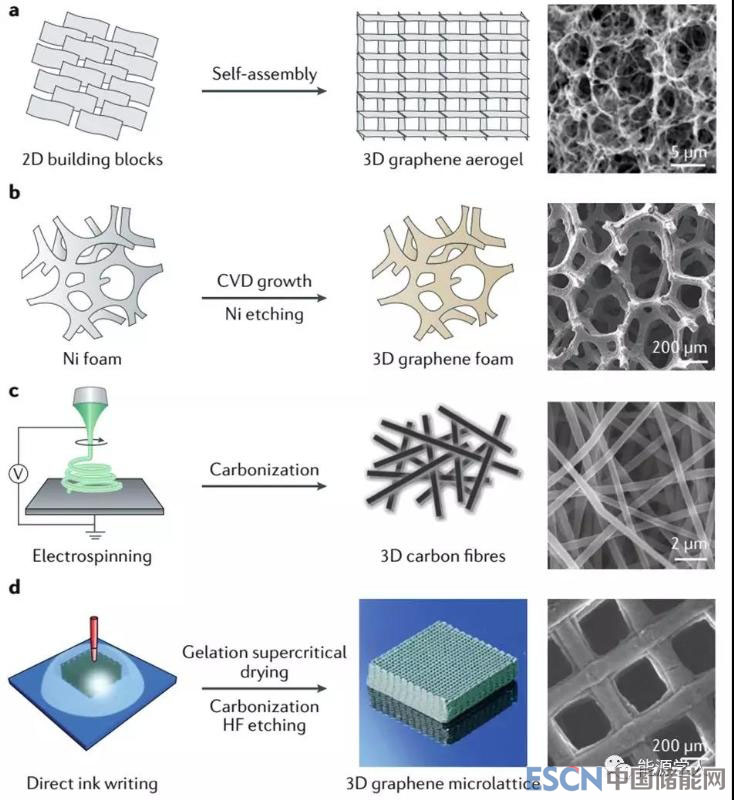 圖3 制造各種3D碳結(jié)構(gòu)。a)將2D石墨烯片溶液可處理組裝成3D石墨烯氣凝膠。b)在Ni泡沫模板上化學(xué)氣相沉積(CVD)生長(zhǎng)石墨烯泡沫,然后通過(guò)蝕刻方法去除模板。c)靜電紡絲3D碳纖維網(wǎng)絡(luò)。d)3D石墨烯微晶的直接墨水書(shū)寫(xiě)(3D打印)。