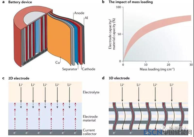圖2 面積質(zhì)量負(fù)荷和電池電極結(jié)構(gòu)的作用。a)商用電池裝置的典型配置。b) 電極的容量與電極上活性材料的質(zhì)量負(fù)載成正比。c) 具有2D集電器的常規(guī)電極中的電荷傳輸路徑顯示出有限的電荷穿透深度。d) 厚電極中的電荷傳輸路徑顯示出在整個(gè)電極厚度上的有效電荷傳遞。
