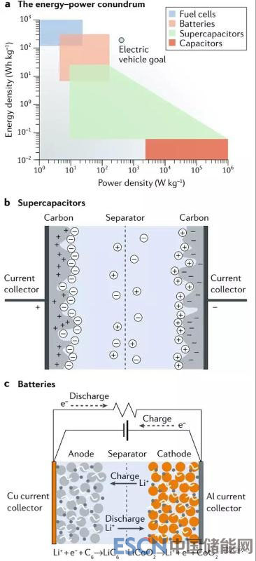 目前主要有四種類型的EES設(shè)備:電容器,超級(jí)電容器,電池和燃料電池,每種都有其優(yōu)點(diǎn)和局限性。燃料電池有超高能量密度,但受限于動(dòng)力學(xué)緩慢和貴金屬催化劑昂貴。電容器受到極低能量密度的限制,通常不適合移動(dòng)電源應(yīng)用。因此,電池和超級(jí)電容器是當(dāng)今市場(chǎng)上的主要EES技術(shù)。電池提供高能量密度但功率密度適中,而超級(jí)電容器提供相反的功能:優(yōu)越的功率密度(~10kW/kg),但能量密度有限(≤15Wh/kg)。盡管存在顯著差異,但電池和超級(jí)電容器機(jī)理一致,包括活性電極材料中電子傳輸和離子傳輸(和存儲(chǔ))的基本過(guò)程。事實(shí)上,能量存儲(chǔ)的本質(zhì)是電極材料中離子形式的電荷存儲(chǔ)。