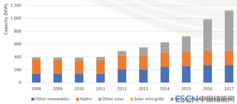從2008年到2017年,該地區(qū)離網(wǎng)可再生能源累計裝機(jī)容量已從231 MW增至2017年的近1200 MW。太陽能技術(shù)一直是離網(wǎng)容量增長的關(guān)鍵驅(qū)動力,超過820 MW容量的太陽能照明、家庭系統(tǒng)和微電網(wǎng)等完成了部署。同期,小型水力電網(wǎng)的裝機(jī)容量從124 MW增長到162 MW。