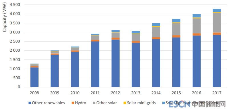 從2008年到2017年,離網(wǎng)可再生能源的裝機(jī)容量增長了2倍多,從2 GW增加到6.5 GW。其中有一部分用于家庭供電,但大多數(shù)(83%)用于工業(yè)(如聯(lián)合發(fā)電)、商業(yè)(如為電信基礎(chǔ)設(shè)施供電)和公共用能終端(如街道照明、水泵)。