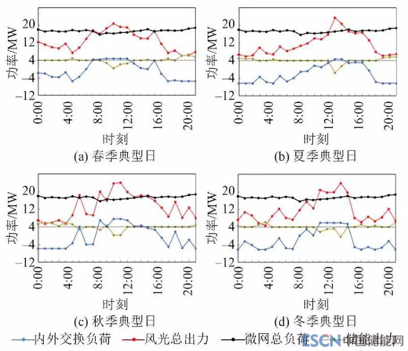 圖9和圖10為傳統(tǒng)運(yùn)營模式和一體化運(yùn)營模式下,春、夏、秋、冬四季典型日微網(wǎng)的運(yùn)行情況(儲能出力負(fù)值表示充電,內(nèi)外交換負(fù)荷負(fù)值表示外。