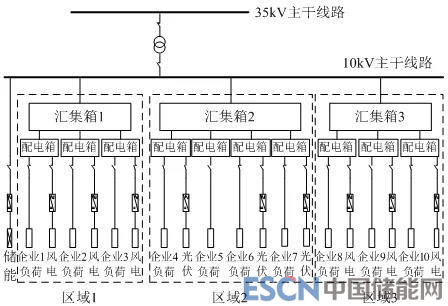 微網(wǎng)分為3塊區(qū)域,均為大工業(yè)用戶,電壓等級為10kV,最大負(fù)荷為11.13MW。項(xiàng)目壽命周期為20年,設(shè)備綜合造價及相關(guān)成本參考當(dāng)?shù)貥?biāo)準(zhǔn),基準(zhǔn)折現(xiàn)率取7%。傳統(tǒng)運(yùn)營模式下微網(wǎng)項(xiàng)目總投資約1.62億元,其中源側(cè)約14500萬元,網(wǎng)側(cè)投約310萬元,儲側(cè)約900萬元,信息化平臺(能量管理系統(tǒng))約500萬元;一體化運(yùn)營模式總投資約1.68億元,其中源網(wǎng)儲側(cè)投資變化不大,信息化平臺(大數(shù)據(jù)云計算平臺、微平衡市場交易系統(tǒng)、能量管理系統(tǒng))約1100萬元。圖7為微網(wǎng)接線方案示意圖。